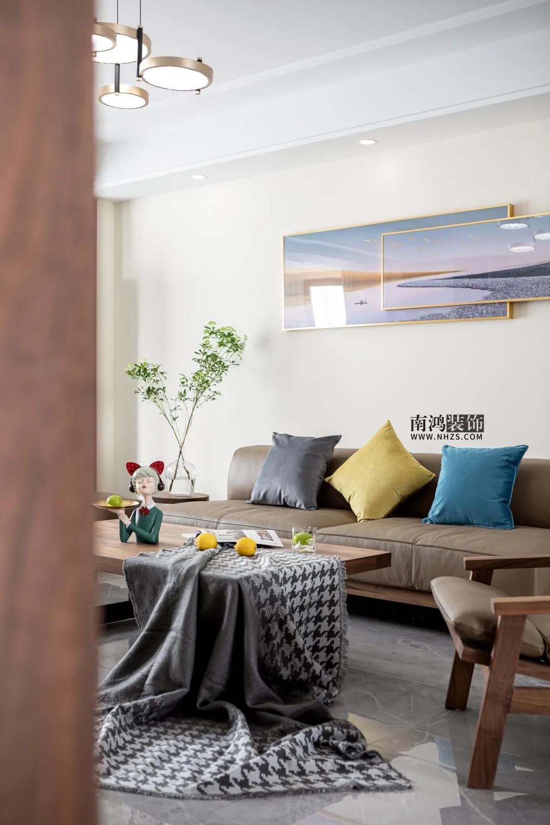 客廳與陽臺打通,讓陽光能恣意地傾灑進來。室內,胡桃木色的家具較為沉靜,卻也容易流露出呆板,我們便添加入清新的軟裝、可愛的擺件進行中和,豐富色彩,活躍氛圍。