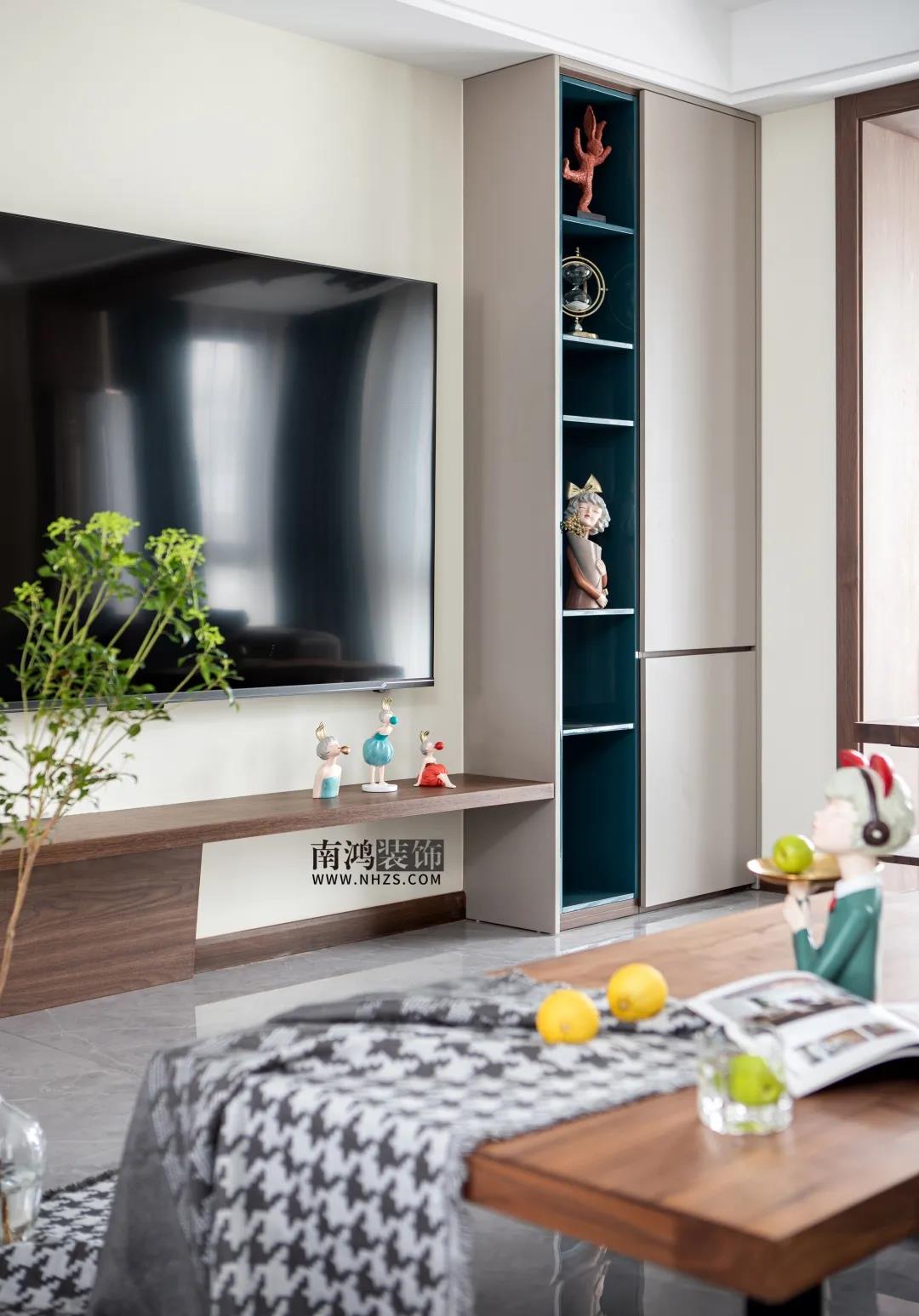 墻面米白色的乳膠漆呈現明快而溫馨的空間感,電視背景墻一側是通往書房的隱形門,另一側則打造一排收納柜用以展示和儲物。